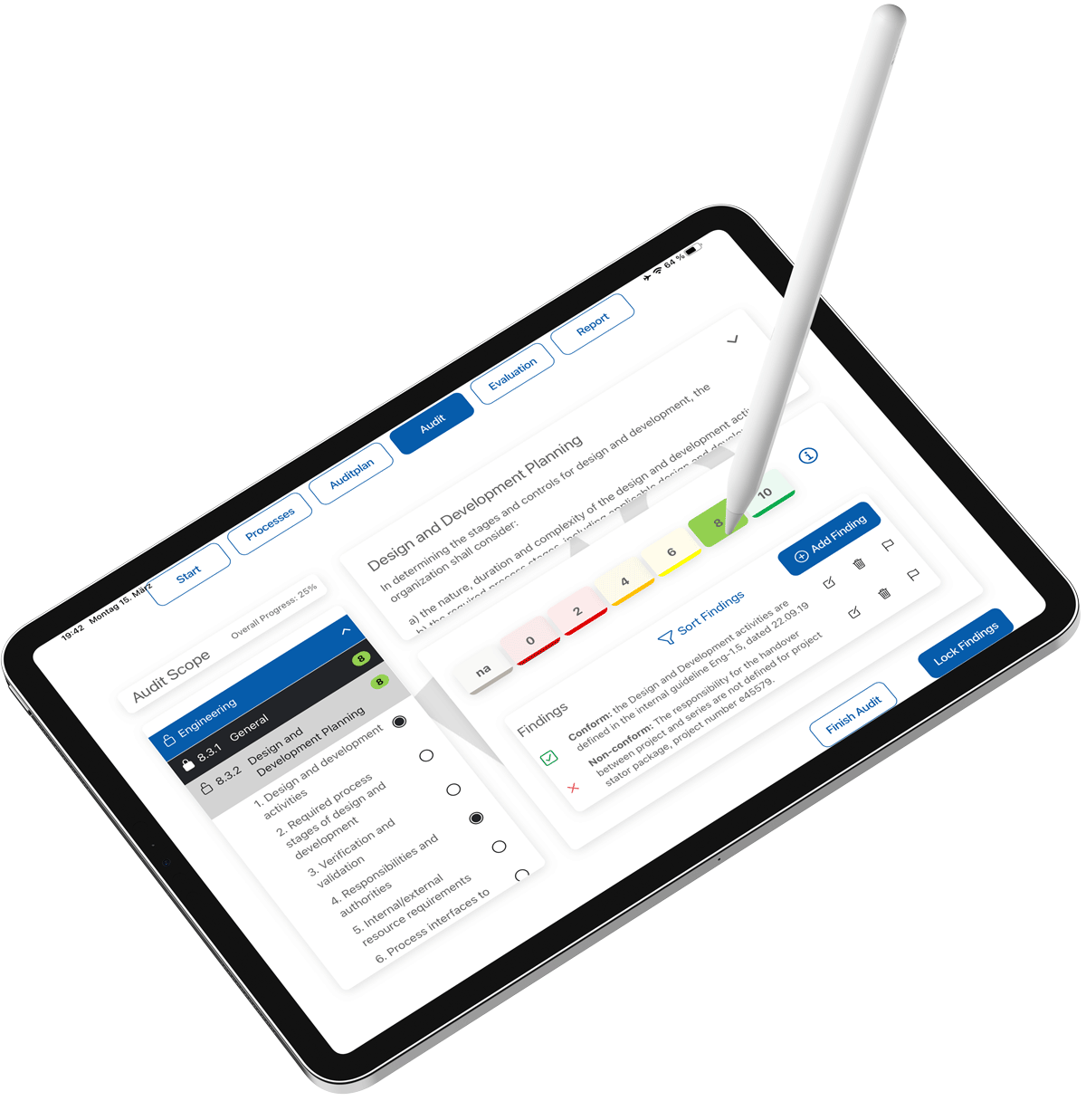 Die landesspezifischen Anforderungen des MDSAP stellen für Auditoren eine wesentliche Herausforderung dar. Innerhalb Paragon Audit werden diese Requirements einzeln ausgewählt, spezifisch bewertet und beantwortet. Durch visuelle Unterstützung hat der Auditor stets den vollen Überblick der Anforderungen und deren Abarbeitungsstand.